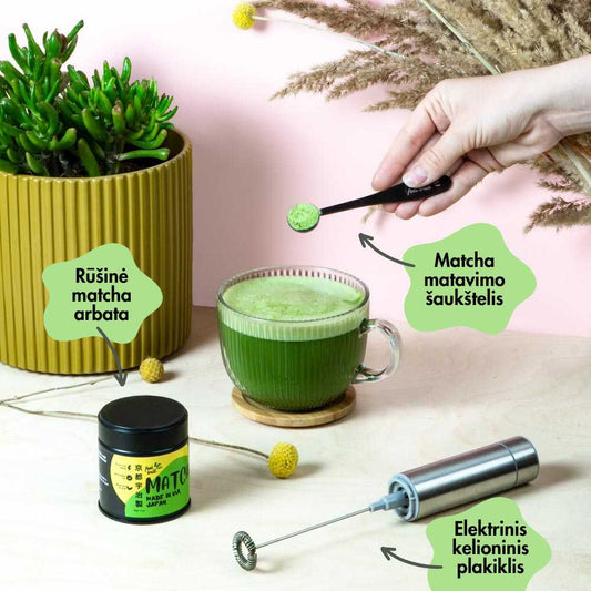 Viskas, ko reikia norint lengvai ir greitai pasigaminti skanų puodelį matcha arbatos - vienoje pakuotėje.