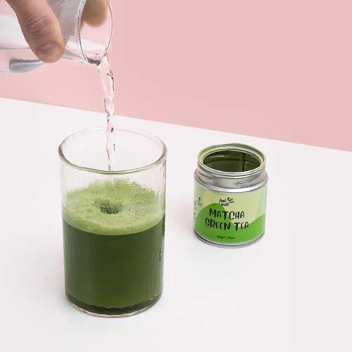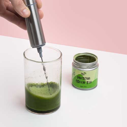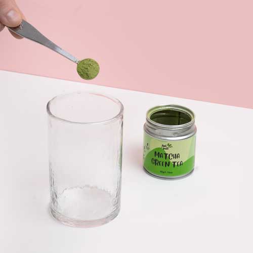 - Į puodelį įberk 1–2 gramus (apie pusę arbatinio šaukštelio) matcha miltelių.